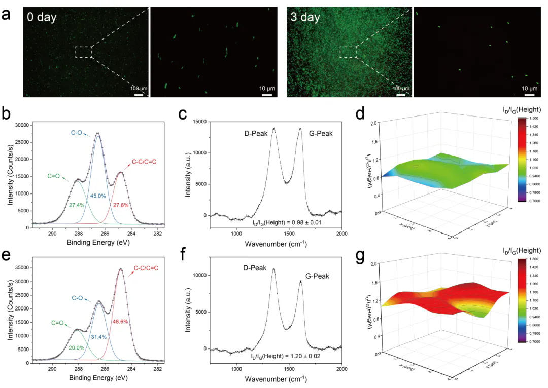 活/死檢測(cè)結(jié)果展示,細(xì)菌在水凝膠中仍然可以保持活性,并可將氧化石墨烯(GO)還原為還原氧化石墨烯(rGO)(圖3)。具體來看,C1s XPS光譜顯示,與GO對(duì)照樣品相比,MR-1 rGO樣品中C-C/C=C鍵的百分比顯著增加(從27.6%增加到48.6%),而C-O/C=O鍵的百分比相應(yīng)減少(從72.4%減少到51.5%),這表明含氧C鍵顯著減少。拉曼光譜中D峰和G峰的強(qiáng)度比(ID/IG)與sp2共軛區(qū)域成反比,該比值從0.98增加到1.2,為GO的成功還原提供了有力證據(jù);并且,強(qiáng)度比(ID/IG)在約3天時(shí)達(dá)到平臺(tái)期,這意味著水凝膠中的GO已完全還原。此外,水凝膠中的GO對(duì)S.?oneidensis?MR-1的生長沒有顯著影響,在濃度范圍為0.5 mg/mL至5 mg/mL的GO條件下,均未觀察到抑菌圈的形成。在整個(gè)培養(yǎng)過程中,細(xì)菌的存活率保持在80%以上,充分表明其代謝活性得以保存。拉曼成像圖案顯示出GO還原在水凝膠中的均一性。