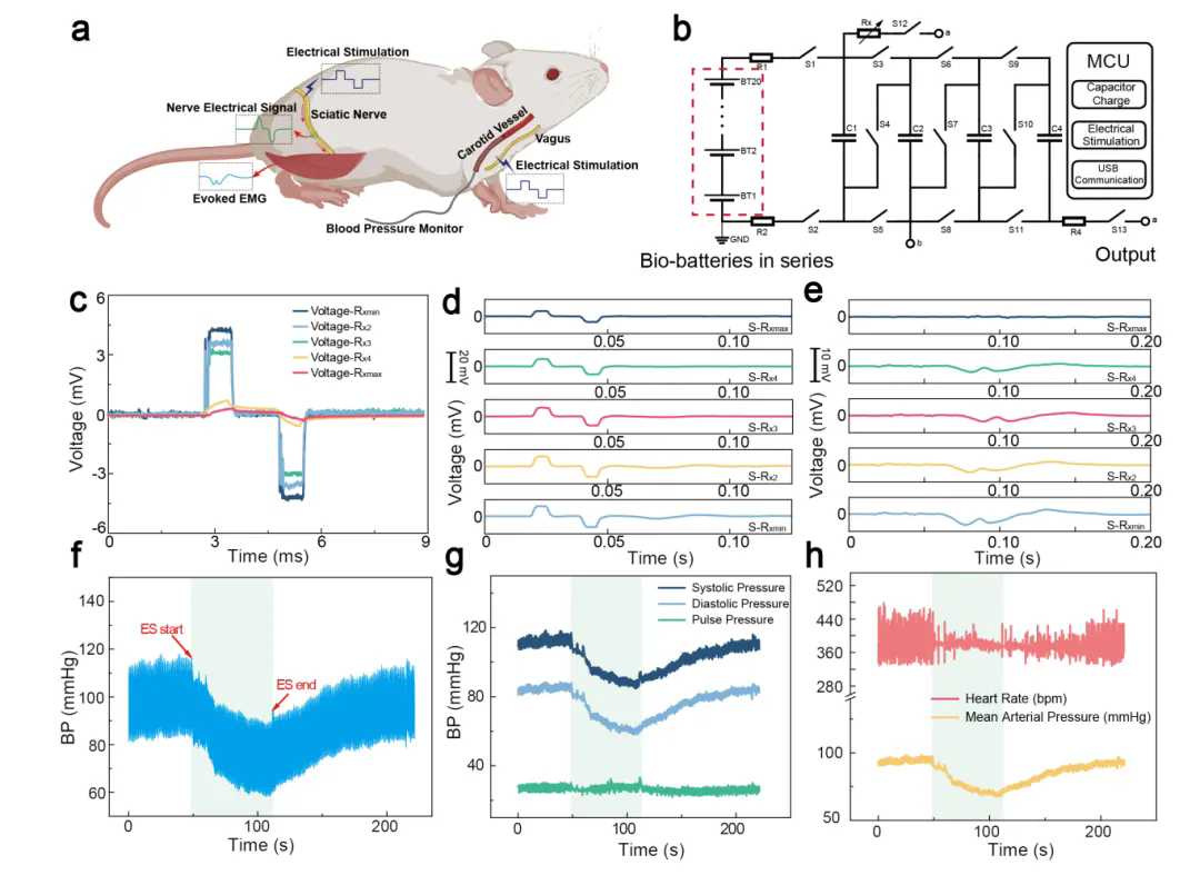 本項(xiàng)目進(jìn)一步探究了生物電池在神經(jīng)刺激方面的應(yīng)用(圖5),以期在疾病治療領(lǐng)域發(fā)揮重要作用。研究人員通過添加電容器,實(shí)現(xiàn)了生物電池電能的可控收集和釋放,進(jìn)而能夠精準(zhǔn)控制刺激的輸出電壓和電流。在刺激坐骨神經(jīng)并監(jiān)測(cè)其神經(jīng)信號(hào)和肌電信號(hào)的實(shí)驗(yàn)中,研究人員發(fā)現(xiàn),隨著刺激強(qiáng)度的增加,誘發(fā)的神經(jīng)動(dòng)作電位和肌內(nèi)肌電信號(hào)的幅度逐漸增大。這種誘發(fā)電位的獲取在電刺激干預(yù)和促進(jìn)生物體的恢復(fù)和治療方面具有重要應(yīng)用價(jià)值。此外,研究人員將可控電刺激電路的輸出端通過電極連接到大鼠的迷走神經(jīng)上,成功實(shí)現(xiàn)了對(duì)大鼠血壓的調(diào)節(jié)。在刺激前,大鼠的血壓保持在基線水平;對(duì)迷走神經(jīng)施加電刺激后,大鼠血壓表現(xiàn)出統(tǒng)計(jì)學(xué)上顯著的降低(p<0.01)。這種干預(yù)方法與現(xiàn)有的超聲干預(yù)等物理治療方法具有相似的效果。停止刺激后,大鼠的血壓由于其內(nèi)在血壓調(diào)節(jié)機(jī)制逐漸呈現(xiàn)上升趨勢(shì),接近基線水平。在刺激期間,收縮壓、舒張壓、脈壓、心率和平均動(dòng)脈壓與刺激前水平相比,均出現(xiàn)了顯著降低(p<0.01),這主要源于迷走神經(jīng)對(duì)心血管功能的抑制作用。