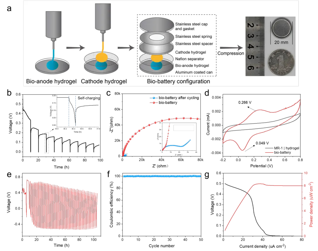 受鋰離子電池制造技術(shù)啟發(fā),研究人員利用活體水凝膠作為生物陽級(jí)墨水,含有K?[Fe(CN)?]的海藻酸鹽水凝膠作為陰極墨水,Nafion膜作為離子交換膜,制備出直徑20毫米、高度3.2毫米的微型生物電池(圖4)。該電池的發(fā)電源于水凝膠內(nèi)細(xì)菌的代謝活動(dòng),在細(xì)菌生長10小時(shí)后,生物電池能夠達(dá)到450毫伏的電壓。該生物電池可以進(jìn)行自充電,實(shí)現(xiàn)長達(dá)10次的自充電-放電循環(huán)。在整個(gè)循環(huán)中,細(xì)菌維持了超過70%的高存活率,在循環(huán)結(jié)束時(shí)存活率更是高達(dá)97%,這充分證明細(xì)菌在電池內(nèi)部仍然保持著生長和代謝活動(dòng)。生物電池的電壓隨著陰極中K?[Fe(CN)?]濃度的增加而升高。同樣,細(xì)菌在連續(xù)運(yùn)行100小時(shí)后,也保持了超過90%的高存活率。