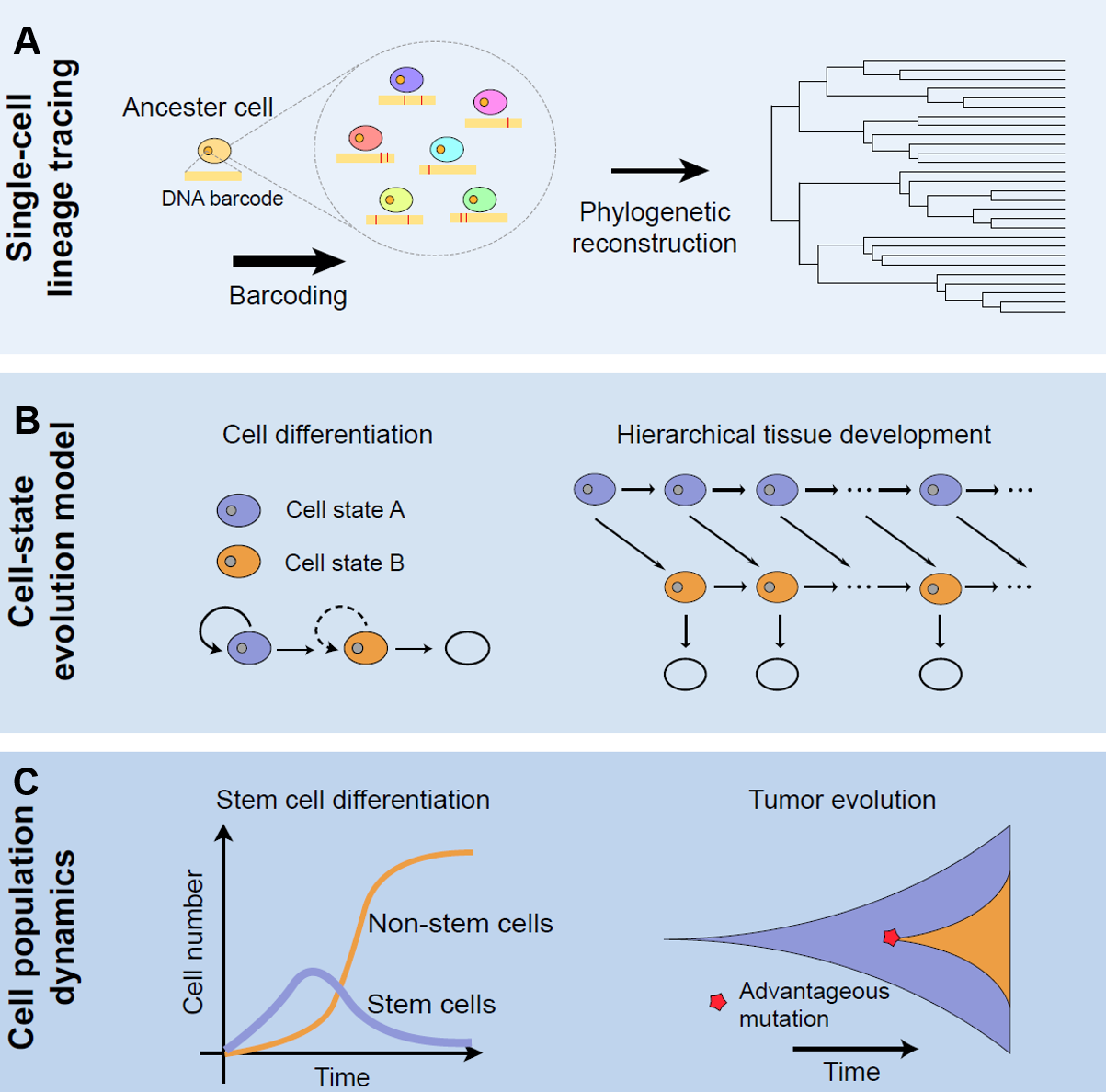 演化動(dòng)力學(xué)通過整合群體遺傳學(xué)與動(dòng)力學(xué)模型,利用基因序列構(gòu)建的系統(tǒng)發(fā)育樹推斷種群擴(kuò)張、遷移等演化參數(shù),從而定量解析種群演化和病毒傳播的群體動(dòng)態(tài)規(guī)律。近年來,該方法被引入多細(xì)胞生物發(fā)育與腫瘤演化領(lǐng)域。然而,傳統(tǒng)模型受到簡化假設(shè)限制,難以精準(zhǔn)刻畫和推斷真實(shí)組織中細(xì)胞譜系多樣性、動(dòng)態(tài)分化和增殖速率差異等復(fù)雜場景。