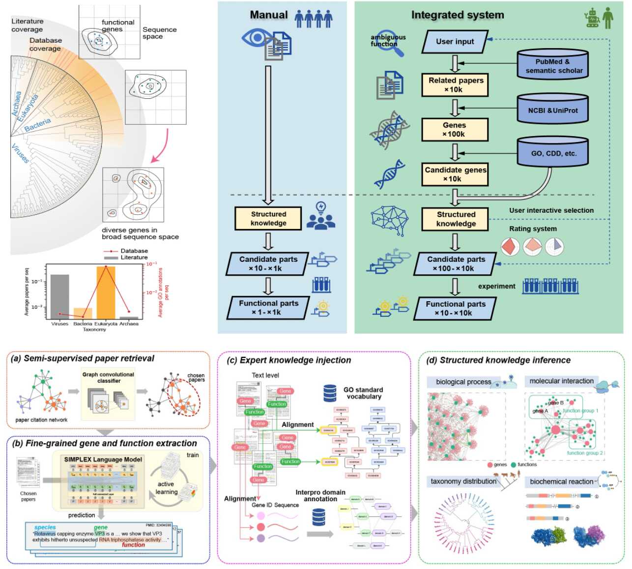 天然生物基因組蘊藏著海量功能基因,這些基因在進化過程中不斷優(yōu)化,形成了多樣化的序列空間和復(fù)雜精巧的功能活性,賦予生物體適應(yīng)復(fù)雜環(huán)境的獨特優(yōu)勢。隨著高通量測序技術(shù)的發(fā)展,全球生物序列數(shù)據(jù)庫已突破數(shù)十億規(guī)模,為生物制造和合成生物學提供了前所未有的基因元件資源庫。然而,盡管這些天然基因蘊含著巨大的應(yīng)用潛力,目前僅有少數(shù)明星基因(如基因編輯工具酶)得到了系統(tǒng)的注釋和結(jié)構(gòu)解析。這種研究的不均衡導(dǎo)致現(xiàn)有基于序列、結(jié)構(gòu)或深度學習的基因挖掘技術(shù)和蛋白質(zhì)設(shè)計方法難以應(yīng)用于更復(fù)雜的基因系統(tǒng),嚴重制約了高價值功能基因的開發(fā)與利用。