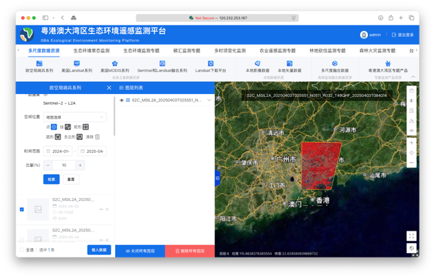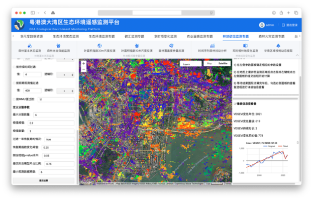 "我們研發(fā)的系統(tǒng)平臺能夠在線調(diào)取并處理多類別遙感數(shù)據(jù)。"陳勁松介紹,該系統(tǒng)平臺構建了包括在線衛(wèi)星數(shù)據(jù)資源(Landsat系列,Sentinel系列)、本地數(shù)據(jù)資源、專題監(jiān)測產(chǎn)品、基礎底圖數(shù)據(jù)的多源時空數(shù)據(jù)庫,同時系統(tǒng)與Google Earth Engine進行了接口對齊,并綜合考慮了時空檢索和數(shù)據(jù)更新需求,能夠實現(xiàn)面向粵港澳大灣區(qū)國土資源與生態(tài)環(huán)境監(jiān)測的時空數(shù)據(jù)的在線調(diào)度、管理、計算、存儲與產(chǎn)品可視化渲染以及在線統(tǒng)計分析服務。