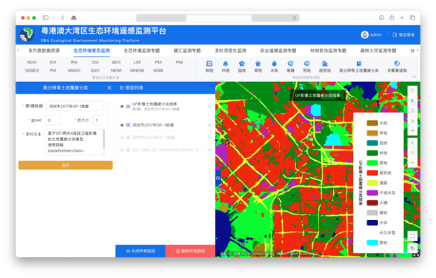 該平臺系統(tǒng)由“國家重點研發(fā)計劃”、“深圳市可持續(xù)發(fā)展專項”等項目支持搭建,利用分布式存儲、云服務檢索及在線可視化等技術,集多源數(shù)據(jù)在線調(diào)取、多模型算法實時計算、在線可視化統(tǒng)計分析等功能于一體,能夠實現(xiàn)實時衛(wèi)星數(shù)據(jù)接入、遙感生態(tài)參量在線計算、地表要素人工智能在線提取、區(qū)域變化在線分析、生態(tài)風險動態(tài)評估、災害信息動態(tài)查看以及生態(tài)紅線內(nèi)要素動態(tài)監(jiān)測預警等多類別業(yè)務應用。研究成果將服務于粵港澳大灣區(qū)國土資源變化智能監(jiān)測及生態(tài)環(huán)境質(zhì)量診斷評估,助力于推動粵港澳大灣區(qū)“天-空-地一體化”遙感生態(tài)環(huán)境監(jiān)測系統(tǒng)技術體系發(fā)展,能夠為粵港澳大灣區(qū)生態(tài)文明建設提供強有力的科技支撐。
