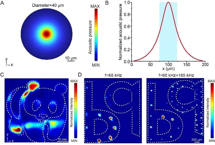 研究團隊在聚二甲基硅氧烷(PDMS)上設(shè)計直徑為40 μm的微腔結(jié)構(gòu),并利用液體表面張力的作用,在微腔處產(chǎn)生了穩(wěn)定的氣泡。這種無外殼束縛的氣泡在165 kHz共振頻率(波長:~9 mm)激發(fā)下,產(chǎn)生明顯的非線性振動,成功產(chǎn)生了寬度僅為1/186波長的超深亞波長聲束,比聲波波長小2個數(shù)量級。當(dāng)氣泡直徑為20微米時,聲束寬度達到24微米。而且,當(dāng)大規(guī)模共振氣泡排布成不同的圖案時,可實現(xiàn)圖案化聲場的構(gòu)建。例如,1.2萬個共振氣泡就能精確“描繪”出熊貓圖案的聲場分布。此外,通過改變氣泡的大小并精準(zhǔn)控制其在不同空間位置的共振狀態(tài),還能實現(xiàn)對聲場的動態(tài)調(diào)控。比如,組成圖案b的氣泡直徑為100 μm,q圖形中的氣泡粒徑為40 μm。當(dāng)利用68 kHz超聲激勵氣泡時,可構(gòu)建“b”圖案的聲場;當(dāng)同時施加68 kHz和165 kHz激勵時,可產(chǎn)生“bq”復(fù)合圖案的聲場。