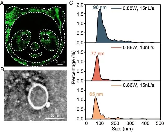 圖3:(A)大規(guī)模氣泡共振捕獲20 μm顆粒;(B)分離出來的外泌體的形態(tài)結(jié)構(gòu);(C)實現(xiàn)外泌體亞類分離