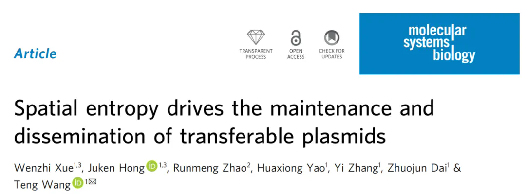 5月1日,王騰研究員課題組在Molecular Systems Biology上發(fā)表了題為"Spatial entropy drives the maintenance?and dissemination of transferable plasmids"的研究論文。該工作首次將物理學(xué)中“熵”的概念引入微生物生態(tài)學(xué),揭示了空間結(jié)構(gòu)驅(qū)動基因水平轉(zhuǎn)移的普適機制。