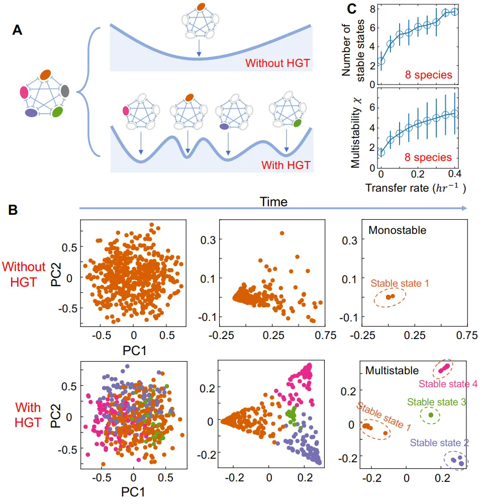 微生物群落在相同環(huán)境中常呈現(xiàn)不同的穩(wěn)定狀態(tài),但其多穩(wěn)態(tài)的起源機制尚不明確。以往研究聚焦于物種互作和資源競爭,而水平基因轉(zhuǎn)移(HGT)作為微生物進化的重要驅(qū)動力,其作用長期被忽視。HGT通過可移動遺傳元件(MGEs)改變宿主生長速率和種間相互作用,可能重塑群落穩(wěn)定性,然而HGT如何影響多穩(wěn)態(tài)的形成仍缺乏系統(tǒng)性研究。理解這一機制對揭示微生物群落動態(tài)及調(diào)控具有重要意義。