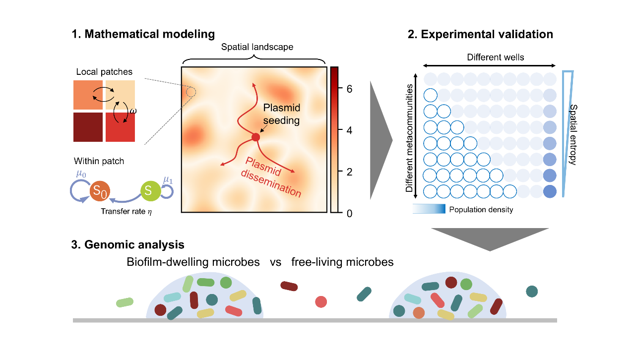 質(zhì)粒作為可轉(zhuǎn)移遺傳元件,是抗生素耐藥基因(ARGs)傳播的主要載體,其擴(kuò)散機(jī)制的研究對遏制耐藥性爆發(fā)至關(guān)重要。經(jīng)典理論基于均勻混合環(huán)境假設(shè),提出質(zhì)粒維持需高轉(zhuǎn)移率閾值,但自然微生物群落普遍存在空間異質(zhì)性(如生物膜、微塑料聚集),現(xiàn)有模型難以解釋復(fù)雜環(huán)境中質(zhì)粒的穩(wěn)定性。傳統(tǒng)理論預(yù)測與實際觀測的差距(如自然質(zhì)粒轉(zhuǎn)移率常低于理論閾值)表明,空間結(jié)構(gòu)對基因流動的影響尚未被充分解析,亟需建立整合空間異質(zhì)性的理論框架。