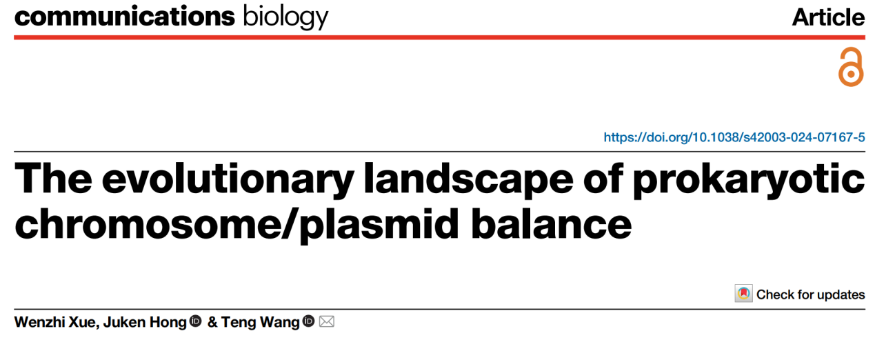 此前不久,王騰團(tuán)隊在Communications Biology上發(fā)表了題為“The evolutionary landscape of prokaryotic chromosome/plasmid balance”的研究論文。該工作解析了原核生物染色體/質(zhì)粒平衡的多層次選擇機(jī)制,為質(zhì)粒的演化動力提出了全新的理論框架。