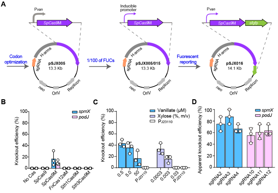 其次,研究團(tuán)隊(duì)通過(guò)調(diào)控SpCas9M的表達(dá)水平來(lái)提升編輯效率。研究人員測(cè)試了兩種誘導(dǎo)型啟動(dòng)子,香草酸誘導(dǎo)型啟動(dòng)子(Pvan)和木糖誘導(dǎo)型啟動(dòng)子(Pxyl),檢測(cè)不同誘導(dǎo)劑濃度下的基因編輯效率。結(jié)果發(fā)現(xiàn)相對(duì)較低的SpCas9M表達(dá)水平更有利于新月柄桿菌的基因組編輯,編輯效率最高可達(dá)到40%左右。