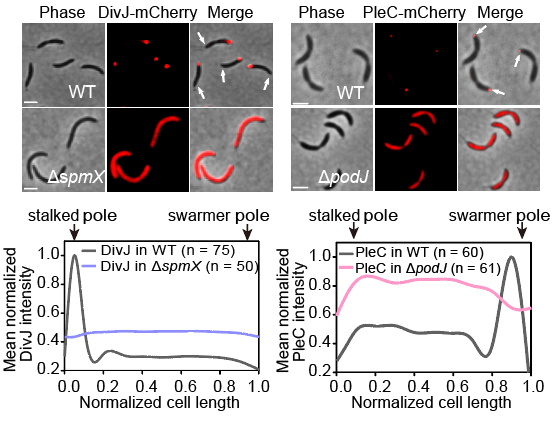 圖3. DivJ-mCherry和PleC-mCherry分別在單敲除突變體ΔpodJ和ΔspmX中的分布