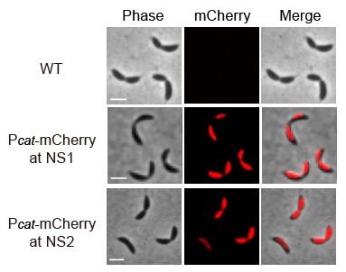 迄今為止,科學(xué)家尚未能實(shí)現(xiàn)新月柄桿菌中無(wú)標(biāo)記的基因插入。為解決這一難題,研究人員應(yīng)用CRISPR/SpCas9M-報(bào)告系統(tǒng)測(cè)試了靶向基因插入的可行性。利用基因敲入進(jìn)行功能獲得性研究時(shí),研究人員選擇中性插入位點(diǎn)(Neutral Insertion Site, NIS)以避免基因極性效應(yīng)。研究人員通過(guò)targetFinder鑒定出一組新月柄桿菌潛在中性插入位點(diǎn),并選取評(píng)分最高的NIS位點(diǎn)。當(dāng)利用CRISPR/SpCas9M-報(bào)告系統(tǒng)將Pcat-mcherry敲入到中性位點(diǎn)后,倒置熒光顯微鏡下可觀察到菌株內(nèi)的mCherry紅色熒光信號(hào),證實(shí)該基因被正確插入且有效轉(zhuǎn)錄翻譯。此外,敲入菌株均未檢測(cè)到明顯的生長(zhǎng)及形態(tài)學(xué)改變,表明這些插入位點(diǎn)不會(huì)對(duì)新月柄桿菌的適應(yīng)性造成顯著影響。