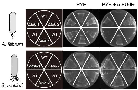 為此,研究人員測(cè)試了CRISPR/SpCas9M-報(bào)告系統(tǒng)在農(nóng)桿菌與中華根瘤菌中的編輯能力。實(shí)驗(yàn)選擇編碼胸苷激酶的tdk基因作為靶標(biāo),該酶通過(guò)將5-氟-2′-脫氧尿苷(5-FUdR)磷酸化為毒性類似物氟-dUMP(F-dUMP),使細(xì)胞對(duì)5-FUdR敏感。為驗(yàn)證編輯菌株表型,在含200 μg/ml 5-FUdR的PYE平板上進(jìn)行生長(zhǎng)實(shí)驗(yàn)。結(jié)果顯示:Δtdk菌株可在含5-FUdR的平板上存活,而野生型中華根瘤菌與農(nóng)桿菌則無(wú)法生長(zhǎng)。