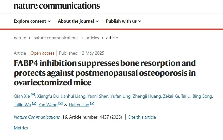 Nature Communications | 靶向抑制FABP4可為絕經(jīng)后骨質(zhì)疏松癥提供新療法