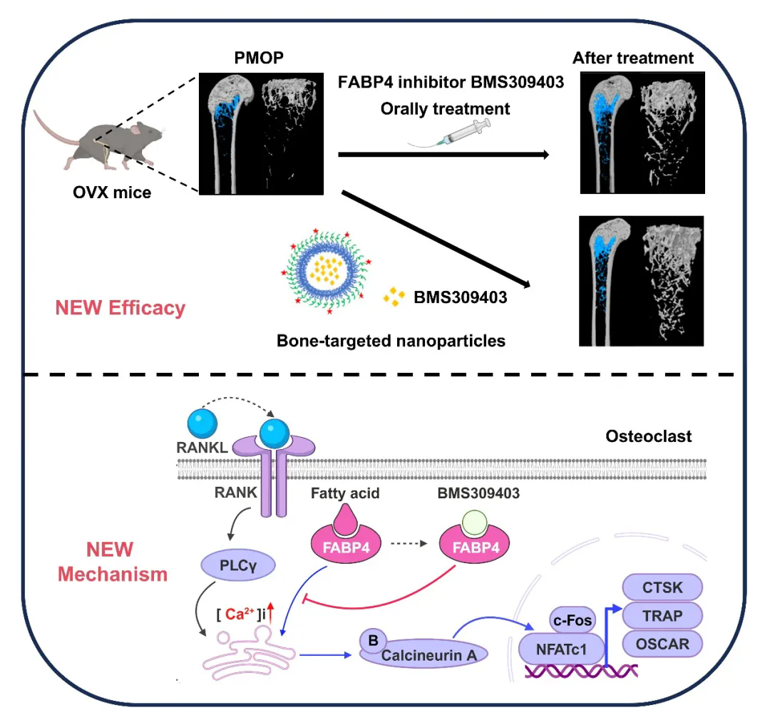 本研究顯示,臨床PMOP患者血清中FABP4水平顯著升高,且與骨密度呈負(fù)相關(guān)關(guān)系。此外,在卵巢切除小鼠模型中,F(xiàn)ABP4在血清及骨髓腔內(nèi)均高表達(dá)。體外實(shí)驗(yàn)進(jìn)一步證實(shí),F(xiàn)ABP4蛋白對(duì)BMSC的成骨分化無(wú)顯著影響,但能顯著促進(jìn)破骨前體細(xì)胞的分化與成熟。藥效學(xué)研究表明,F(xiàn)ABP4抑制劑BMS309403對(duì)破骨細(xì)胞分化的IC50為0.89 μM,與常用臨床藥物阿侖膦酸鈉(IC50 = 0.44 μM)接近。機(jī)制上,F(xiàn)ABP4可通過(guò)激活Ca2+-Calcineurin-NFATc1信號(hào)通路,促進(jìn)破骨細(xì)胞分化。在卵巢切除小鼠中,口服BMS309403可顯著抑制長(zhǎng)骨和腰椎松質(zhì)骨的骨質(zhì)流失,并有效改善長(zhǎng)骨的彈性模量和剛性。進(jìn)一步通過(guò)骨靶向納米粒子遞送BMS309403治療后,其抗骨質(zhì)疏松效果與阿侖膦酸鈉相當(dāng)甚至更優(yōu),顯示了良好的應(yīng)用前景。