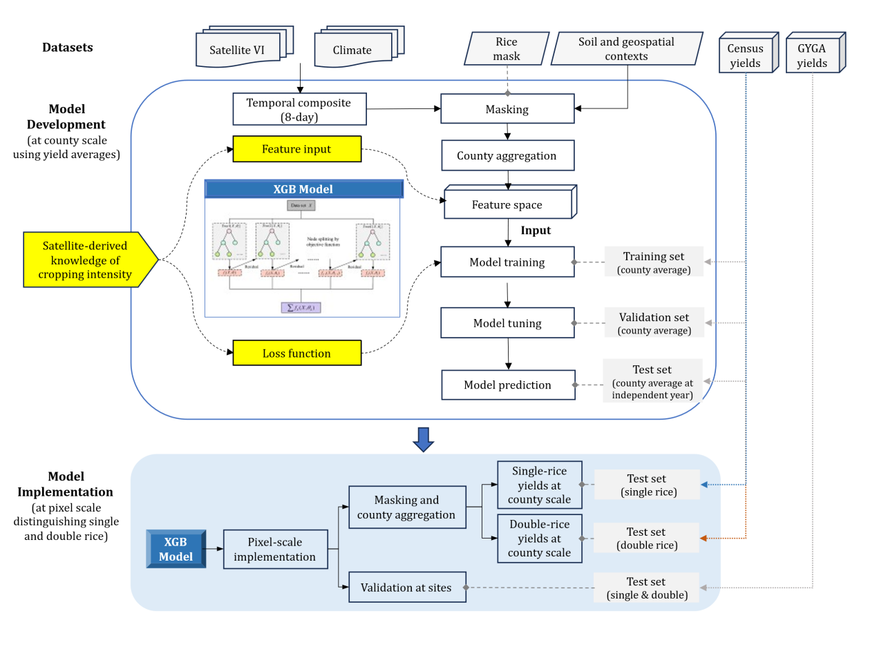 中國科學(xué)院深圳先進技術(shù)研究院數(shù)字所陳勁松研究員、王靖雯助理研究員,聯(lián)合北京大學(xué)等研究人員在Computers and Electronics in Agriculture上發(fā)表了題為“A knowledge-informed machine learning (KIML) approach to disentangle single- and double-season rice yields and attainable yield gaps in the mixed cropping systems”的研究論文。論文提出了一種知識引導(dǎo)的機器學(xué)習(xí)建??蚣埽行Э朔藗鹘y(tǒng)AI模型對目標(biāo)樣本數(shù)據(jù)的強依賴問題,首次在弱樣本條件下實現(xiàn)了對南方單雙季稻混作區(qū)產(chǎn)量構(gòu)成的精準(zhǔn)識別與未來增產(chǎn)潛力的量化評估。