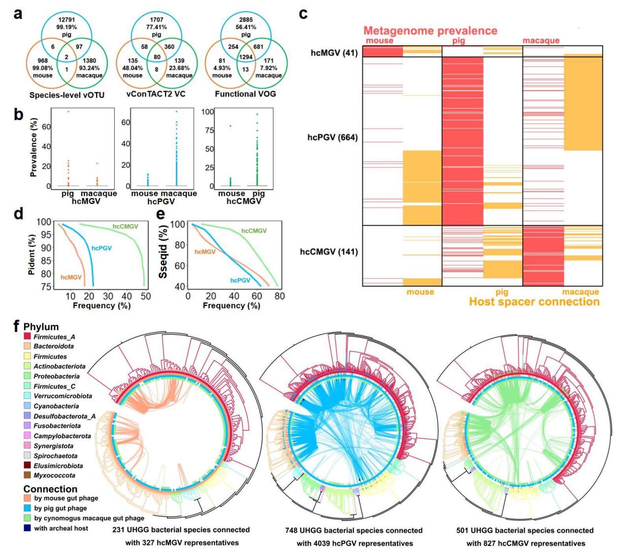 噬菌體占腸道病毒的90%以上,作為腸道菌群的關(guān)鍵調(diào)控因子,與炎癥性腸病、結(jié)直腸癌、糖尿病等疾病密切相關(guān)。盡管小鼠、豬和食蟹猴被廣泛用作腸道研究模型,其噬菌體多樣性仍缺乏系統(tǒng)認(rèn)知,跨物種比較及與人類噬菌體的關(guān)聯(lián)機制研究近乎空白。