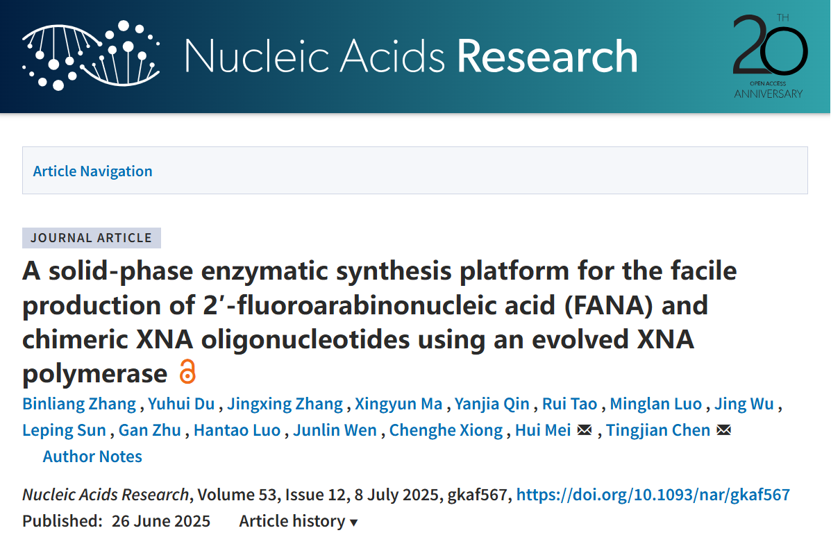 近日,中國(guó)科學(xué)院深圳先進(jìn)技術(shù)研究院合成生物學(xué)研究所梅輝副研究員團(tuán)隊(duì)聯(lián)合華南理工大學(xué)生物科學(xué)與工程學(xué)院陳庭堅(jiān)教授團(tuán)隊(duì)在酶促非天然核酸(XNA)的高效合成技術(shù)開(kāi)發(fā)上取得新突破,相關(guān)成果發(fā)表在國(guó)際頂級(jí)期刊Nucleic Acids Research雜志上,題目為“A Solid-Phase Enzymatic Synthesis Platform for the Facile Production of 2'-Fluoroarabinonucleic Acid (FANA) and Chimeric XNA Oligonucleotides Using an Evolved XNA Polymerase”。中國(guó)科學(xué)院深圳先進(jìn)技術(shù)研究院合成生物學(xué)研究所梅輝副研究員和華南理工大學(xué)生物科學(xué)與工程學(xué)院陳庭堅(jiān)教授為共同通訊作者,華南理工大學(xué)博士生張彬良和副研究員杜宇輝為論文的共同第一作者。