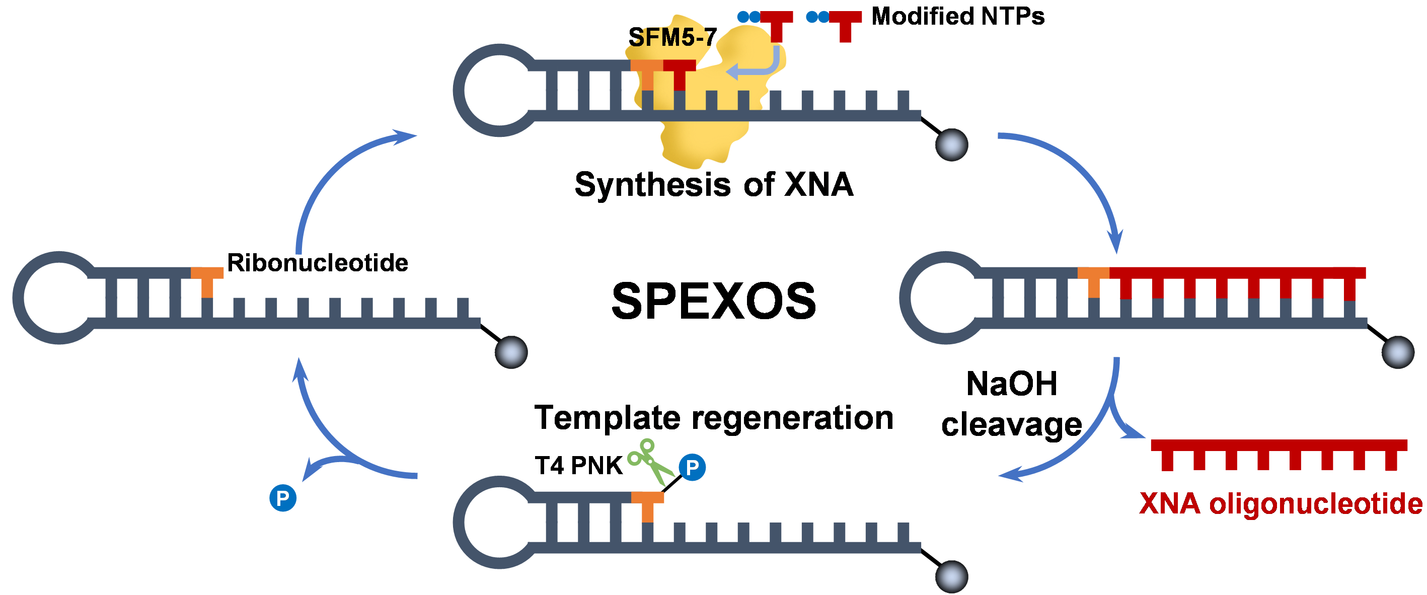 圖1. 基于高效非天然核酸聚合酶的固相酶促XNA寡核苷酸合成(SPEXOS)平臺(tái)