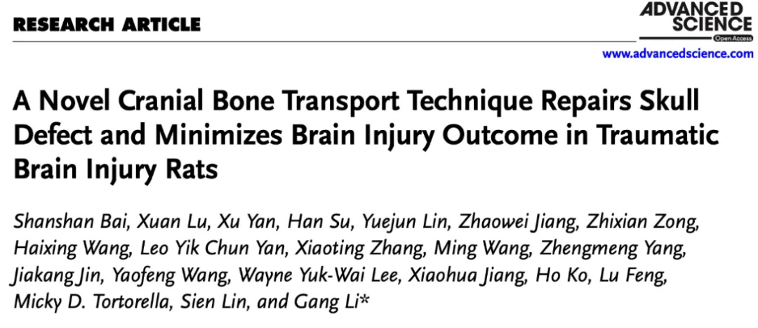 近日,中國科學(xué)院深圳先進技術(shù)研究院生物醫(yī)藥與技術(shù)研究所李剛研究員聯(lián)合香港中文大學(xué)醫(yī)學(xué)院在CBT治療TBI大鼠模型的研究方面取得了重要突破性進展,相關(guān)成果以"A novel cranial bone transport technique repairs skull defect and minimizes brain injury outcome in traumatic brain injury rats"為題,發(fā)表在國際權(quán)威期刊Advanced Science上。