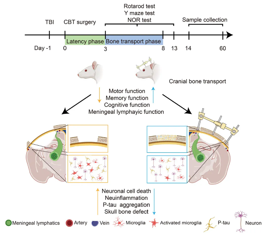顱骨搬移術(shù)(Cranial bone transport, CBT)是一種基于Ilizarov牽拉成組織技術(shù)理論上衍生的外固定技術(shù),持續(xù)牽拉斷裂骨組織的機械傳導(dǎo)不僅能促進骨骼再生,還可誘導(dǎo)微小血管、神經(jīng)等多種組織的再生。目前研究發(fā)現(xiàn)顱骨和腦膜之間存在微小的連接通道,顱骨骨髓中的免疫細胞可通過這些通道快速遷移至腦膜,參與炎癥或損傷修復(fù)。本研究團隊前期研究中已經(jīng)證明CBT通過改善血管生成、神經(jīng)生成和腦膜淋巴功能來促進缺血性卒中大鼠模型(大腦中動脈閉塞)的神經(jīng)功能恢復(fù),此外還發(fā)現(xiàn)CBT能夠顯著促進腦膜淋巴管的再生,并增強其引流功能,從而改善阿爾茨海默病轉(zhuǎn)基因小鼠(5xFAD)的認知能力,減少腦內(nèi)淀粉樣蛋白沉積,并有效緩解神經(jīng)炎癥 。