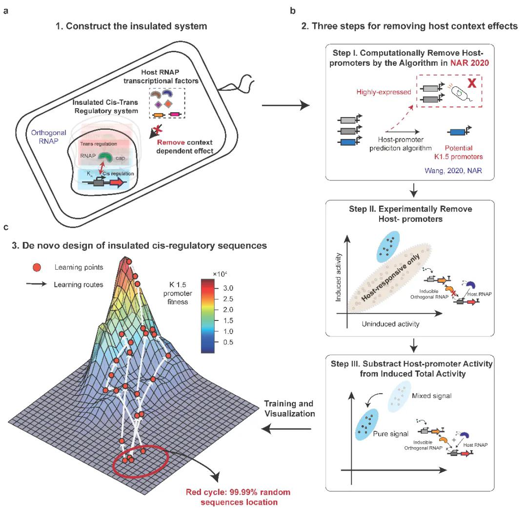 近日,中國科學(xué)院深圳先進(jìn)技術(shù)研究院定量合成生物學(xué)全國重點(diǎn)實(shí)驗(yàn)室、合成生物學(xué)研究所婁春波課題組與清華大學(xué)自動化系汪小我課題組合作開展的研究取得重要進(jìn)展。他們提出并驗(yàn)證了一項(xiàng)關(guān)鍵觀點(diǎn):去除宿主細(xì)胞內(nèi)“污染語料”,是實(shí)現(xiàn)高精度模型預(yù)測及可控從頭設(shè)計(jì)順式基因元件的前提條件。相關(guān)成果以“De novo design of insulated cis-regulatory elements based on deep learning-predicted fitness landscape”為題發(fā)表在國際學(xué)術(shù)期刊Nucleic Acids Research上。