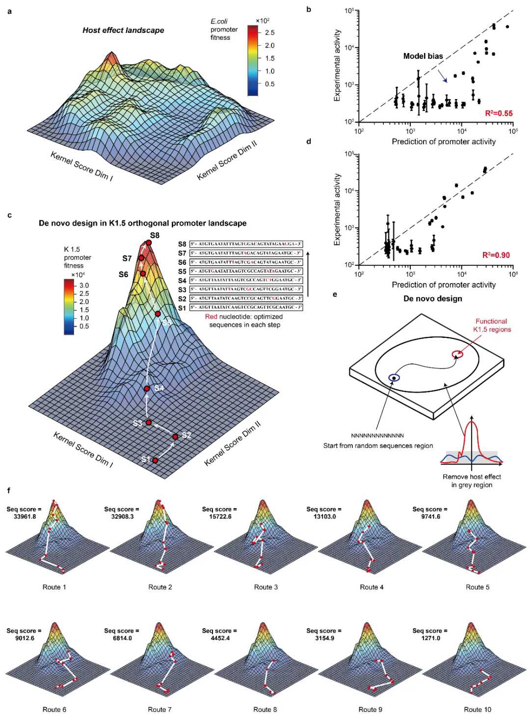 為此,研究團(tuán)隊(duì)設(shè)計(jì)了一套“預(yù)測+實(shí)驗(yàn)雙重篩選”的數(shù)據(jù)凈化流程:首先通過模型預(yù)測識別并排除可能受宿主背景激活的序列,再借助雙通道誘導(dǎo)實(shí)驗(yàn)(有/無IPTG條件)進(jìn)一步篩掉對目標(biāo)RNA聚合酶無響應(yīng)的序列。最終,團(tuán)隊(duì)構(gòu)建出一個僅包含K1.5系統(tǒng)真實(shí)調(diào)控信息、宿主背景干擾最小化的高質(zhì)量數(shù)據(jù)集。