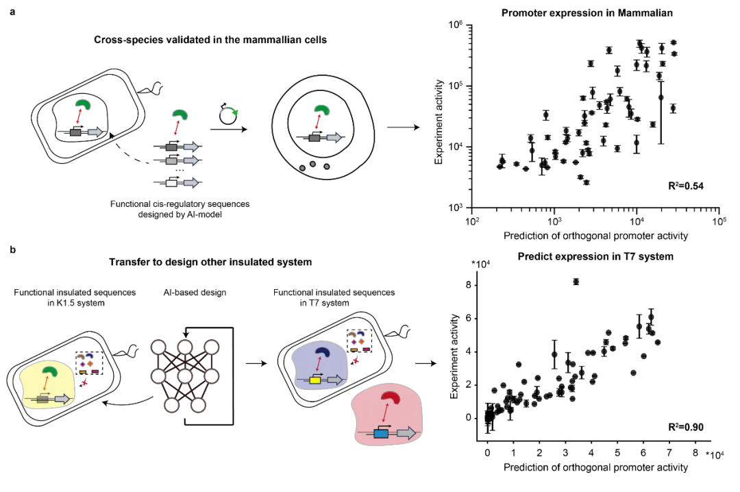 這類“非目標(biāo)”信號會對AI模型形成誤導(dǎo),使得它學(xué)到的規(guī)律僅在特定宿主內(nèi)有效,無法遷移到其他物種或新的表達(dá)系統(tǒng)。要真正實(shí)現(xiàn)可預(yù)測、可遷移的功能元件設(shè)計(jì),就必須從源頭上去掉此類背景干擾,建立一個真正“正交”(即彼此獨(dú)立、互不干擾)的表達(dá)系統(tǒng),確保AI模型學(xué)到的調(diào)控規(guī)律具有純粹性、可解釋性和可泛化性。