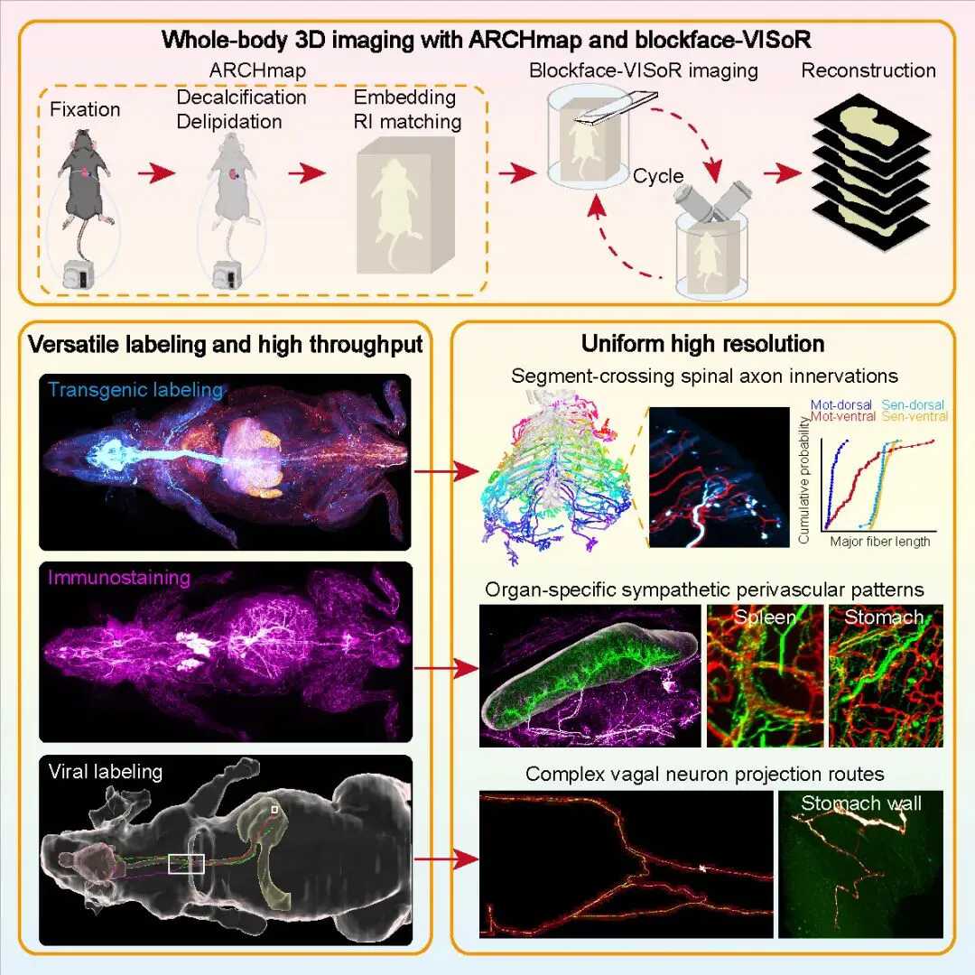 由于樣品制備方法具備高熒光保存性的優(yōu)勢(shì),ARCHmap-blockface-VISoR技術(shù)兼容神經(jīng)科學(xué)領(lǐng)域常用的轉(zhuǎn)基因和嗜神經(jīng)病毒攜帶的熒光蛋白,以及免疫熒光等標(biāo)記方法。結(jié)合上述標(biāo)記和成像技術(shù),研究人員成功解析了小鼠全身不同類型周圍神經(jīng)的精細(xì)結(jié)構(gòu)和單纖維投射路徑,首次揭示了單個(gè)脊神經(jīng)元的跨節(jié)段投射特征,闡明了全身交感神經(jīng)的器官特異性伴血管分布模式,并解析了迷走神經(jīng)的整體投射構(gòu)架和單纖維復(fù)雜投射路徑。
