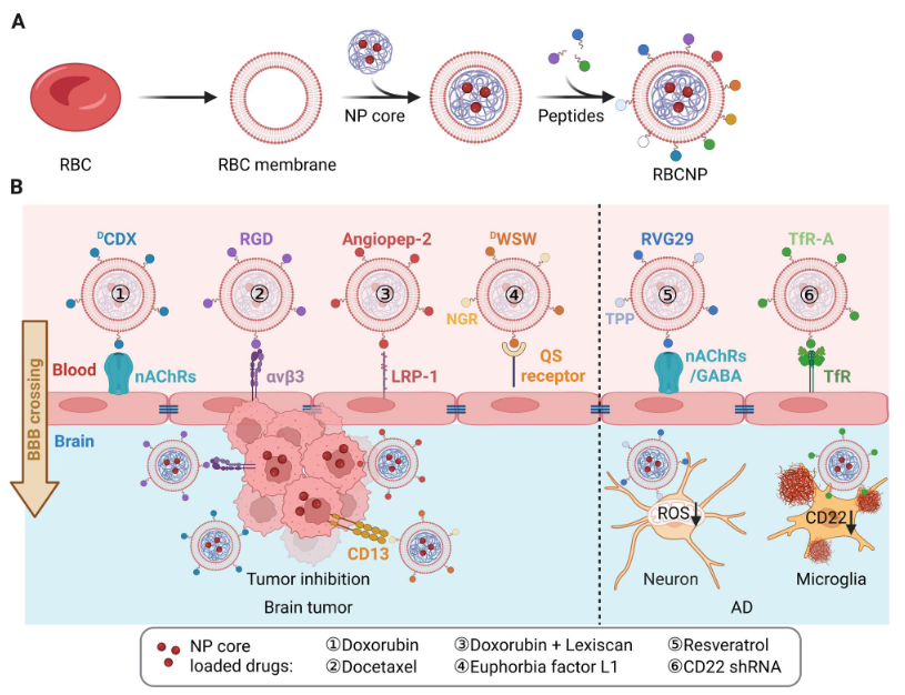源自不同細胞的膜結構天然攜帶特定功能蛋白(如紅細胞膜的CD47賦予免疫逃逸能力,白細胞膜上的整合素介導炎癥靶向),使CNPs能更有效地規(guī)避免疫清除,并利用細胞自身的生物識別機制穿越BBB。研究團隊特別強調,通過進一步工程化修飾(如搭載靶向肽“CDX”、RGD、Angiopep-2等),可顯著提升CNPs的BBB穿透效率和病灶靶向精度。
