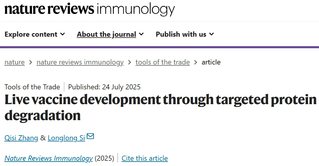7月24日,中國科學院深圳先進技術(shù)研究院定量合成生物學全國重點實驗室、合成生物學研究所司龍龍團隊在Nature Reviews Immunology雜志在線發(fā)表了題為“Live vaccine development through targeted protein degradation(通過蛋白靶向降解開發(fā)活疫苗)”的評述文章,闡述了該團隊建立的蛋白靶向降解(Proteolysis-Targeting,PROTAR)減毒活疫苗策略,并展望了其未來的拓展與應(yīng)用,為新一代活疫苗研發(fā)提供了新思路。
