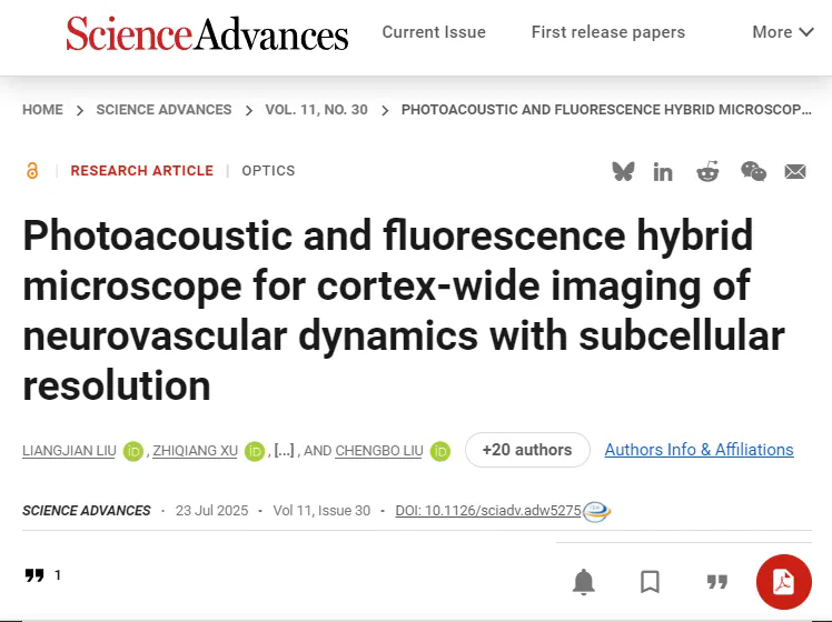 7月23日,中國(guó)科學(xué)院深圳先進(jìn)技術(shù)研究院醫(yī)學(xué)成像科學(xué)與技術(shù)系統(tǒng)全國(guó)重點(diǎn)實(shí)驗(yàn)室鄭海榮院士、劉成波研究員和鄭煒研究員團(tuán)隊(duì),在研發(fā)第一代頭戴式顯微成像(Science Advances, 11, eadu1153, 2025?)基礎(chǔ)上,實(shí)現(xiàn)了技術(shù)再次突破,成功研制出高速大視野光聲/熒光多模態(tài)顯微成像儀器(LiTA-HM),對(duì)活體小鼠全腦皮層范圍內(nèi)神經(jīng)元活動(dòng)和微血管多種參量同時(shí)、動(dòng)態(tài)、高分辨成像,為非侵入式腦機(jī)接口提供了新的信息采集范式。研究成果以"Photoacoustic and fluorescence hybrid microscope for cortex-wide imaging of neurovascular dynamics with subcellular resolution"為題發(fā)表于Science Advances。該期刊同期發(fā)表期刊副主編、美國(guó)杜克大學(xué)Junjie Yao教授Focus文章,對(duì)研究進(jìn)行highlight報(bào)道,評(píng)價(jià):“ LiTA-HM將神經(jīng)活動(dòng)與血管生理融于同一影像,具備空間廣度與時(shí)間精度,為破譯大腦最基礎(chǔ)的神經(jīng)血管協(xié)作機(jī)制提供了可能。這一突破使得學(xué)界向長(zhǎng)久以來的目標(biāo)更近一步——同時(shí)以單神經(jīng)元與單血管的分辨率,實(shí)時(shí)觀測(cè)大腦功能與思維的律動(dòng)。”