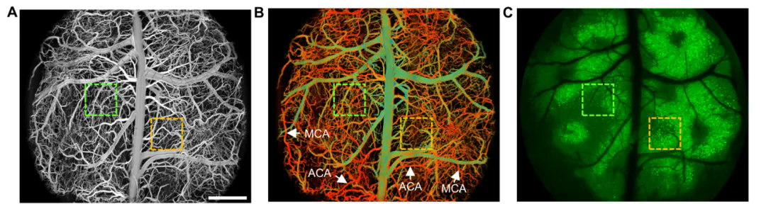 基于上述光學(xué)、關(guān)鍵元器件、系統(tǒng)軟硬件及成像算法創(chuàng)新,研究團(tuán)隊(duì)研制出高速大視野光聲/熒光多模態(tài)顯微成像系統(tǒng)LiTA-HM,實(shí)現(xiàn)了神經(jīng)活動(dòng)與血液動(dòng)力學(xué)參數(shù)的全腦同步采集。該成像系統(tǒng)展現(xiàn)出優(yōu)異的成像性能,在覆蓋全腦皮層的大視野范圍內(nèi),能獲取毛細(xì)血管級(jí)血管網(wǎng)絡(luò)與單個(gè)神經(jīng)元胞體信息,成像結(jié)果如下圖所示。