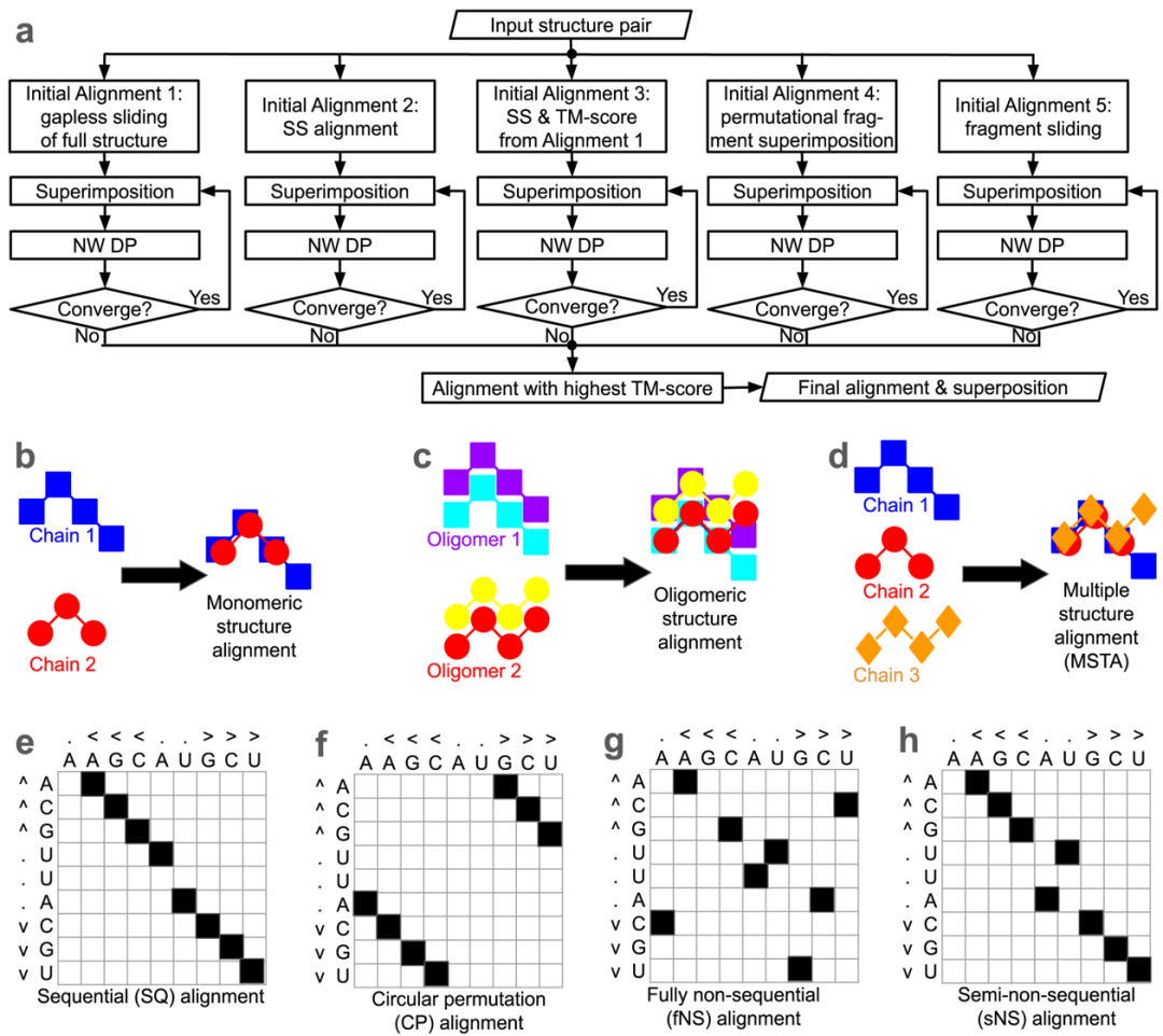 圖1. US-align的算法流程圖(a)與可執(zhí)行的三維結(jié)構(gòu)比對(duì)任務(wù),包括b, 單體結(jié)構(gòu)兩兩比對(duì);c, 復(fù)合物結(jié)構(gòu)兩兩比對(duì);d, 多結(jié)構(gòu)比對(duì);e, 序列順序比對(duì);f, 循環(huán)順序比對(duì);g, 完全非序列順序比對(duì);h, 部分非序列順序比對(duì)。