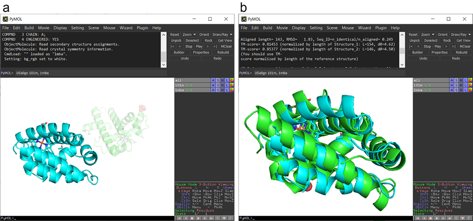 圖2. 通過(guò)PyMOL插件執(zhí)行US-align結(jié)構(gòu)比對(duì)任務(wù)。a, 比對(duì)前。b, 比對(duì)后。