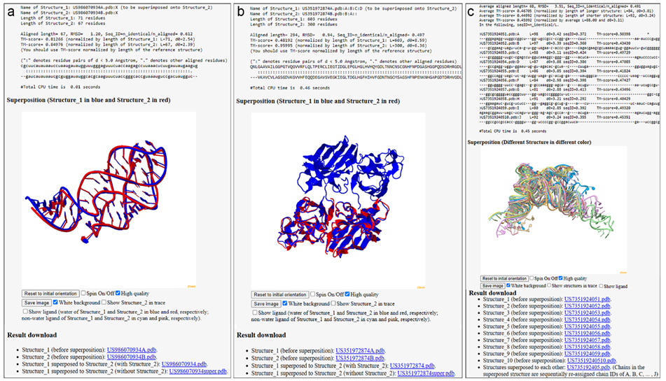 圖3. 通過(guò)網(wǎng)頁(yè)服務(wù)器執(zhí)行US-align比對(duì)任務(wù)的網(wǎng)頁(yè)輸出。a, 單體RNA結(jié)構(gòu)的兩兩比對(duì)。b, 蛋白復(fù)合物的兩兩比對(duì)。c, RNA的多結(jié)構(gòu)比對(duì)。
