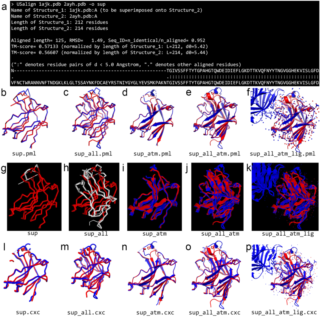 圖4. US-align命令行程序兩兩比對(duì)結(jié)果(a)在PyMOL(b-f)、RasMol(g-k)與UCSF ChimeraX(l-p)分子可視化程序中不同風(fēng)格的三維結(jié)構(gòu)展示。