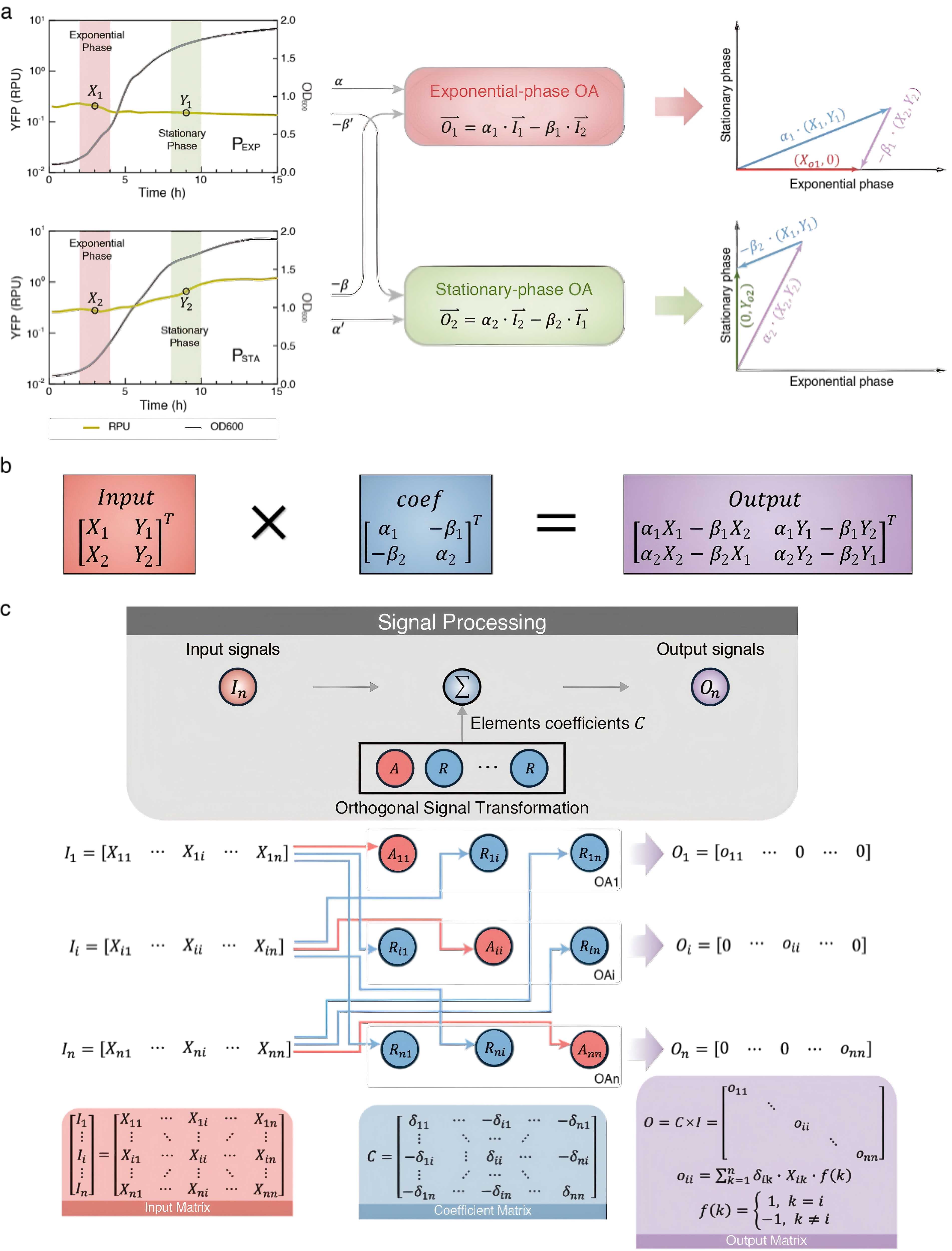 為解決這一核心矛盾,陳業(yè)團隊從模擬電子電路的核心組件——運算放大器(OA)中獲得啟發(fā),創(chuàng)新性地提出了一套全新的解決方案。團隊首先建立了一個通用信號“解碼”框架,將細胞感知復雜環(huán)境并調(diào)整自身基因表達的過程視為一個?“編碼”過程——細胞將多種輸入信號“編碼”成一個混合的、非正交的響應信號。而該工作通過運算放大器實現(xiàn)的信號處理方案,則扮演了“解碼器”的角色??蓪毎傻幕旌闲盘栠M行精確線性運算,將其“解碼”為多個相互正交的干凈信號,從而讓工程師能夠清晰地理解細胞狀態(tài),并施以精準、有效的下游調(diào)控。