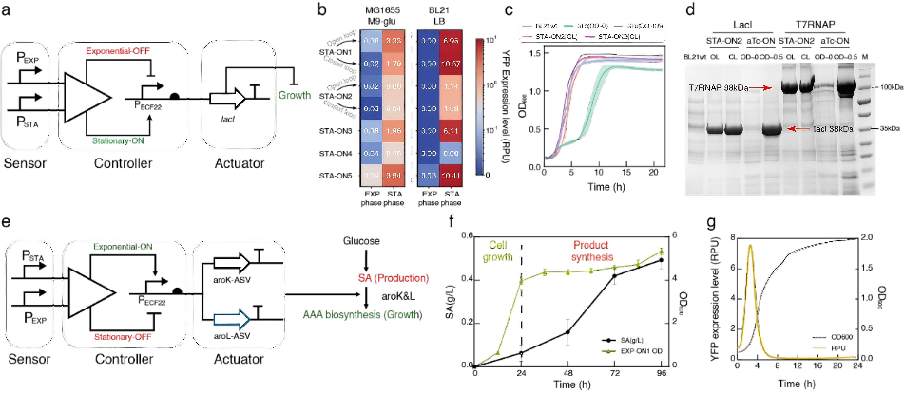 1.?實現(xiàn)了無誘導劑的動態(tài)調(diào)控:在生物制造中,團隊利用該框架,使大腸桿菌能夠“智能”地感知自身所處的生長階段(如指數(shù)期或平臺期),并自主切換基因表達模式——在成長期專注生長,在生產(chǎn)期高效合成目標產(chǎn)物(如莽草酸)。整個過程無需添加昂貴誘導劑,實現(xiàn)了過程自動化和生產(chǎn)高效化。
