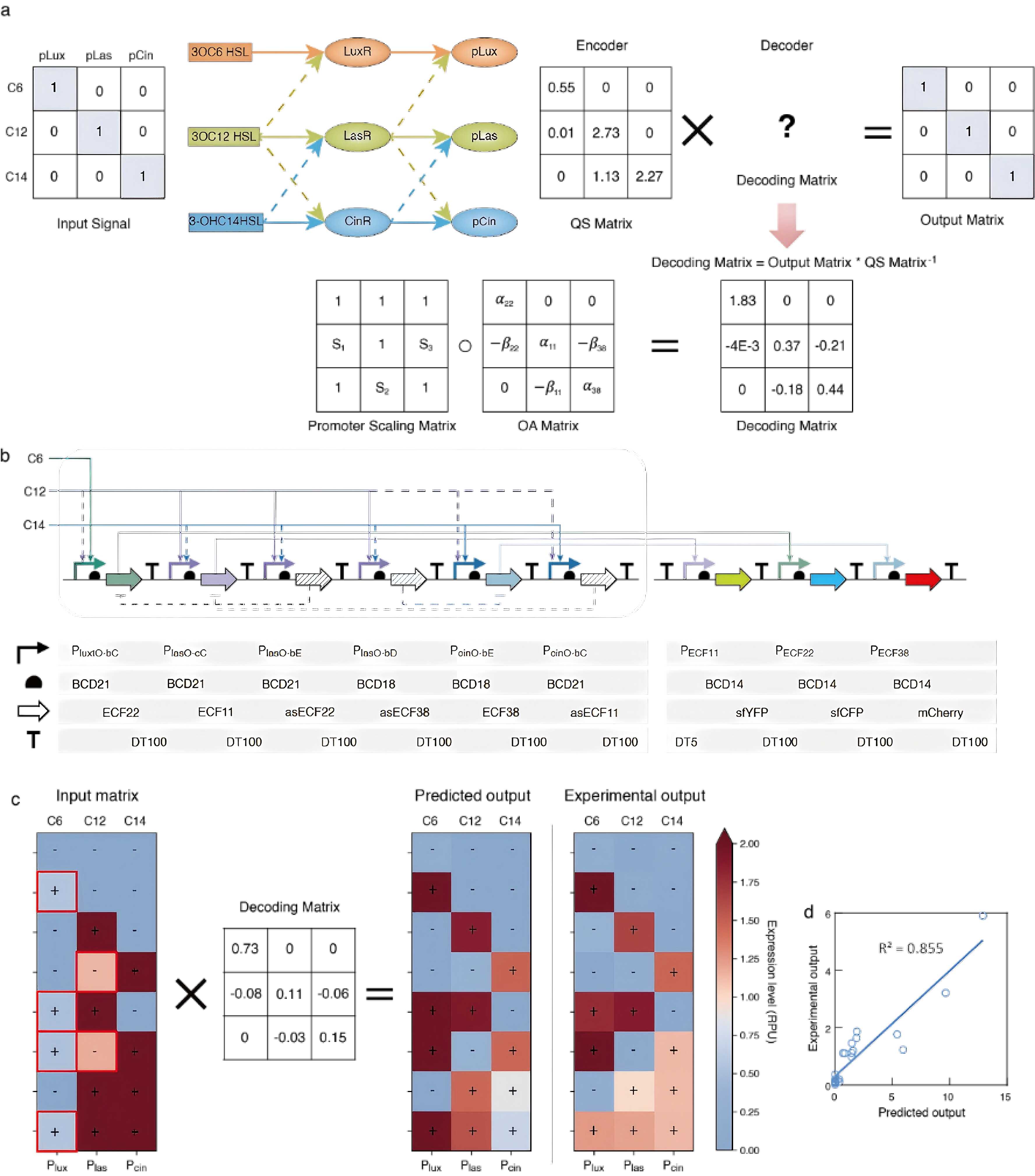 2.?實現(xiàn)了高維信號分解:面對三種常見的細菌群體感應(QS)信號相互“串擾”的復雜情況(包括受體蛋白和DNA識別序列兩類串擾),該框架成功將三維混合信號分解并消除串擾,實現(xiàn)了三個清晰獨立的正交輸出。這充分證明了該框架在處理多維、高復雜度信號系統(tǒng)中的強大能力。