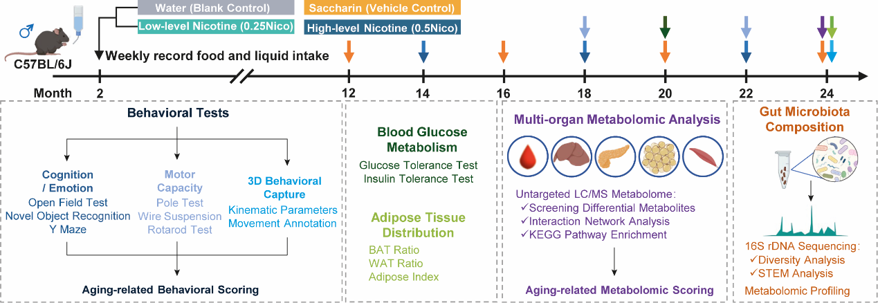本研究采用長達22個月的實驗設計,自小鼠8周齡起分別給予0.25 g/L(低劑量)和0.5 g/L(高劑量)尼古丁溶液,模擬人類長期非吸入式尼古丁暴露情景。研究團隊在14、18、22和24月齡四個關鍵時間點,對小鼠進行了系統(tǒng)性、多維度的行為學評估與多組學檢測,包括情緒、認知、運動和精細行為學監(jiān)測、代謝組學分析以及腸道菌群測序,實現(xiàn)了小鼠長程生命周期生理狀態(tài)的縱向動態(tài)追蹤(圖1)。