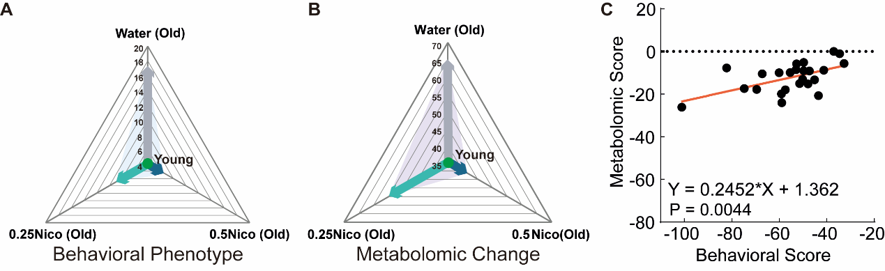 與此同時,研究團隊針對復雜的系統(tǒng)性衰老進程,開發(fā)了創(chuàng)新性的 “行為--代謝年齡評分系統(tǒng)(BMAge)”,整合了行為學表現(xiàn)與多器官關鍵代謝物指標,從而能夠更精準地量化衰老進程的動態(tài)變化。研究顯示,長期飲用尼古丁的小鼠代謝評分呈現(xiàn)出特定的變化模式,為系統(tǒng)性衰老評估及干預研究提供了新的科學工具(圖3)。