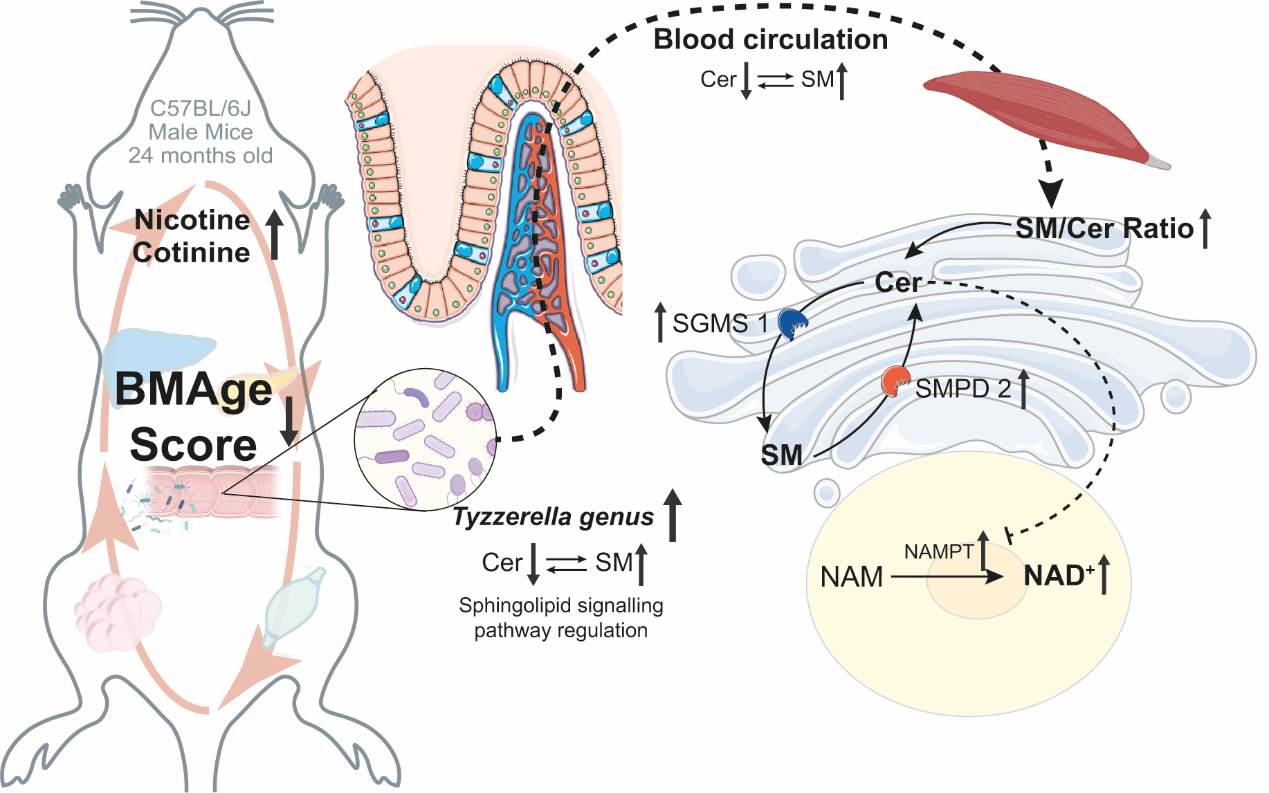 研究發(fā)現(xiàn),長期飲用尼古丁并不顯著影響小鼠的學習記憶或血糖代謝,也未觀察到對肝臟、胰腺等器官的結(jié)構(gòu)性損傷或免疫抑制。值得關注的是,尼古丁在衰老過程中表現(xiàn)出顯著的運動功能保護作用,高劑量組尤為明顯,提示其可能具備抗“運動虛弱”的潛在價值。代謝組學分析顯示,尼古丁可重塑多個器官的能量與脂類代謝通路,其中白色脂肪組織可能發(fā)揮關鍵調(diào)控作用。腸道菌群研究發(fā)現(xiàn),尼古丁可維持Tyzzerella等菌屬的穩(wěn)定豐度。進一步的關聯(lián)網(wǎng)絡分析提示,鞘脂代謝通路的激活可能介導了“腸-—代謝--運動”調(diào)控軸,腸道菌群代謝物富集于鞘脂信號通路,提示尼古丁重塑衰老代謝或通過鞘脂代謝實現(xiàn)。分子信號通路研究進一步表明,尼古丁通過影響鞘磷脂(SM)與神經(jīng)酰胺(Cer)間的平衡、減少Cer相對積累來重塑能量代謝;鞘磷脂合成酶和中性水解酶參與調(diào)控該鞘磷脂-—神經(jīng)酰胺穩(wěn)態(tài),最終可能介導尼古丁在衰老過程中對運動功能下降的保護作用(圖4)。