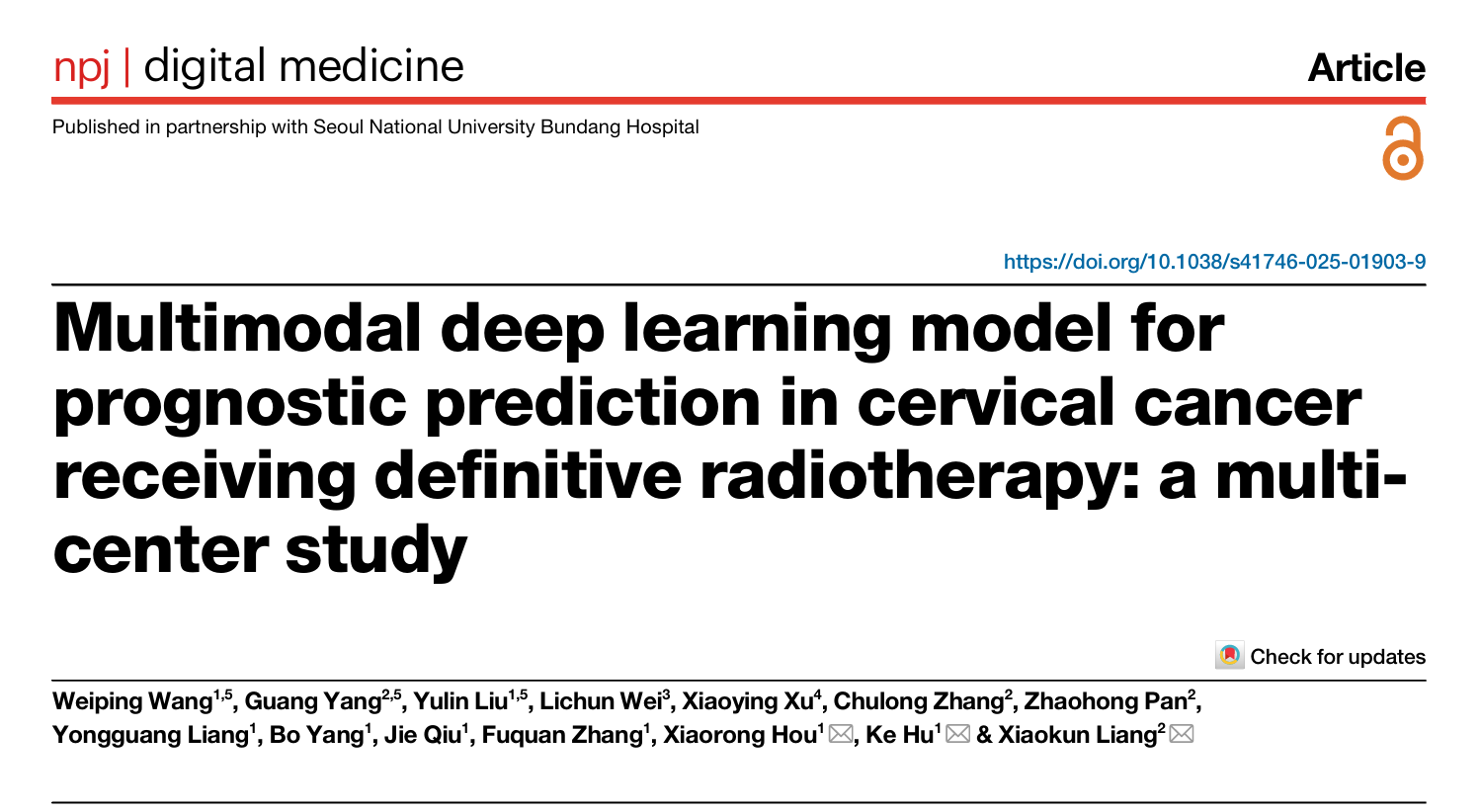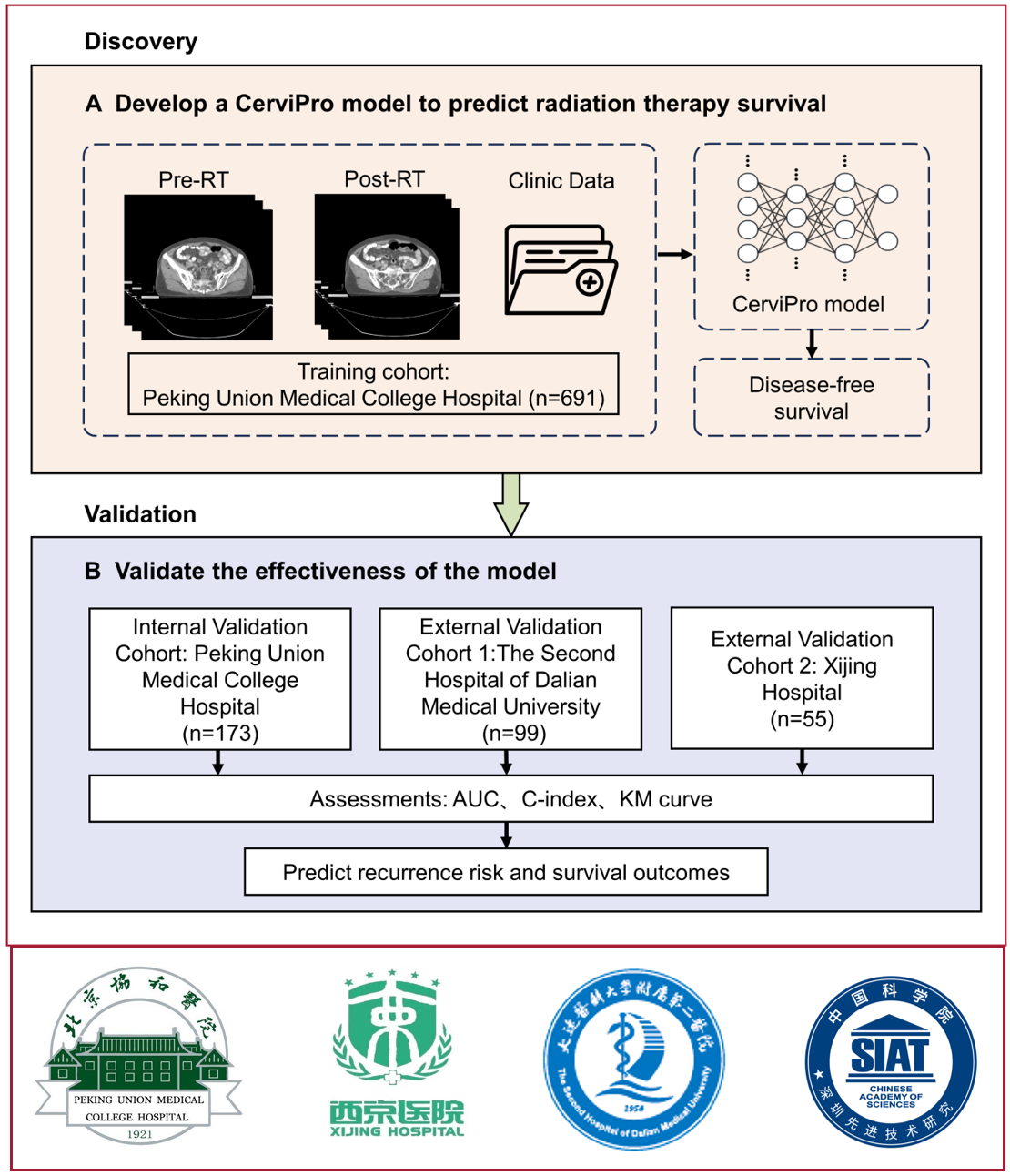 近日,中國(guó)科學(xué)院深圳先進(jìn)技術(shù)研究院(深圳先進(jìn)院)醫(yī)工所梁曉坤副研究員團(tuán)隊(duì),聯(lián)合了北京協(xié)和醫(yī)院、空軍軍醫(yī)大學(xué)西京醫(yī)院、大連醫(yī)科大學(xué)第二附屬醫(yī)院多家頂尖醫(yī)院,成功開發(fā)出一種智能工具——CerviPro多模態(tài)放療預(yù)后預(yù)測(cè)模型。該模型能夠精準(zhǔn)告訴醫(yī)生:患者屬于高風(fēng)險(xiǎn)群體,需加大治療力度;還是低風(fēng)險(xiǎn)群體,可考慮簡(jiǎn)化治療方案等信息。相關(guān)成果以"Multimodal Deep Learning Model for Prognostic Prediction in Cervical Cancer Receiving Definitive Radiotherapy: A Multi-Center Study"為題(圖1),發(fā)表于國(guó)際權(quán)威期刊npj Digital Medicine(IF: 15.1)。