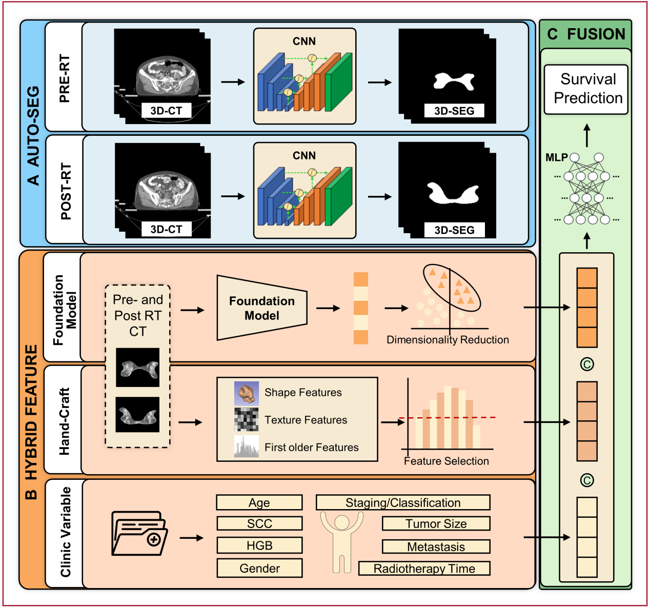研究團(tuán)隊(duì)提出了一種融合放療前后CT基礎(chǔ)模型特征、影像組學(xué)特征與臨床信息的多模態(tài)深度學(xué)習(xí)預(yù)后預(yù)測(cè)方法(圖2)。該方法首先采用基于深度學(xué)習(xí)的自動(dòng)分割技術(shù)精準(zhǔn)提取腫瘤區(qū)域,隨后利用預(yù)訓(xùn)練CT基礎(chǔ)模型提取高維深度特征,并通過(guò)主成分分析降維和特征篩選技術(shù),實(shí)現(xiàn)多源異構(gòu)數(shù)據(jù)的智能融合。
