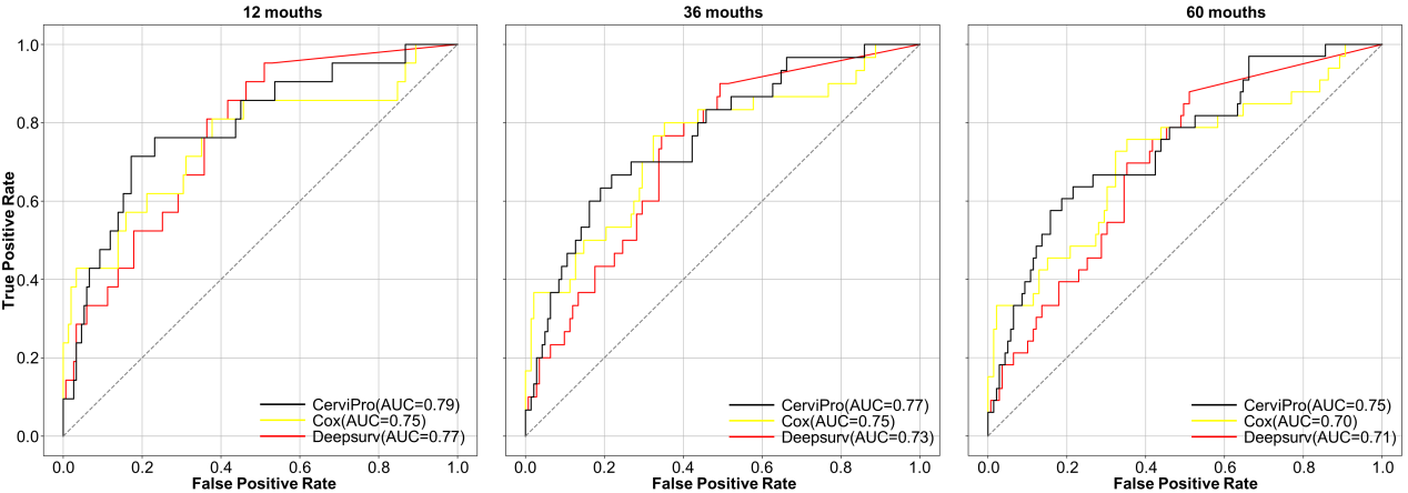為確保模型的臨床實(shí)用性,研究團(tuán)隊(duì)聯(lián)合北京協(xié)和醫(yī)院、空軍軍醫(yī)大學(xué)西京醫(yī)院、大連醫(yī)科大學(xué)第二附屬醫(yī)院,共同收集了1018例宮頸癌患者的多模臨床數(shù)據(jù)(圖3)。通過(guò)多中心驗(yàn)證設(shè)計(jì),驗(yàn)證了模型不僅在單一醫(yī)院表現(xiàn)優(yōu)異,還能適應(yīng)不同醫(yī)院的實(shí)際臨床環(huán)境。提出的CerviPro模型的結(jié)果表現(xiàn)超越傳統(tǒng)Cox模型和DeepSurv模型,體現(xiàn)了整合不同數(shù)據(jù)源的協(xié)同價(jià)值,為臨床醫(yī)生精準(zhǔn)識(shí)別高?;颊?、制定個(gè)體化治療策略提供了可靠的智能決策工具(圖4)。