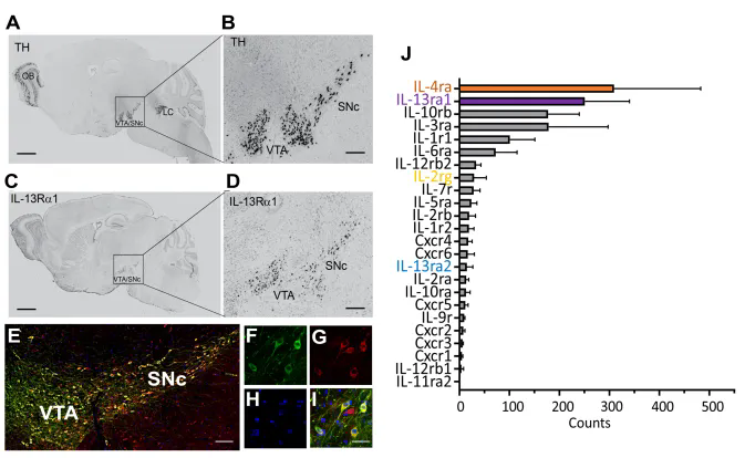 首先,研究團(tuán)隊(duì)利用中腦多巴胺神經(jīng)元的單細(xì)胞核測(cè)序,系統(tǒng)分析了該類神經(jīng)元中主要免疫炎癥因子受體的表達(dá)譜,發(fā)現(xiàn) IL-13Rα1和IL-4R 的表達(dá)量最高。進(jìn)一步通過IL-13Rα1與TH的免疫染色,并結(jié)合Allen Brain Atlas 的原位雜交數(shù)據(jù),確認(rèn)在全腦范圍內(nèi),IL-13Rα1 僅特異性表達(dá)于中腦多巴胺神經(jīng)元(圖 1)。