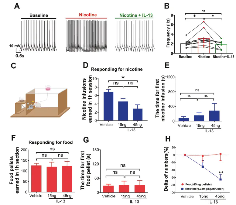 圖3. IL-13可顯著削弱尼古丁對(duì)多巴胺神經(jīng)元的興奮作用,并且顯著干預(yù)大鼠尼古丁靜脈自給藥行為