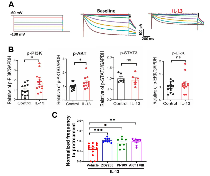 圖4. IL-13對(duì)多巴胺神經(jīng)元活動(dòng)及功能的抑制作用依賴于AKT/PI3K和HCN通道