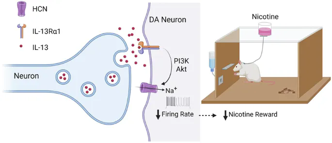 近日,中國科學(xué)院深圳先進(jìn)技術(shù)研究院腦認(rèn)知與腦疾病研究所/深港腦科學(xué)創(chuàng)新研究院陳祖昕、劉欣安團(tuán)隊(duì)聯(lián)合多家國內(nèi)外機(jī)構(gòu),在?Molecular Psychiatry?發(fā)表題為“Interleukin 13 signaling modulates dopaminergic functions and nicotine reward in rodents” 的研究論文。研究首次系統(tǒng)揭示了免疫炎癥因子白細(xì)胞介素-13(IL-13)及其受體對(duì)中腦多巴胺神經(jīng)元活動(dòng)的直接調(diào)控作用,并鑒定PI3K/AKT-HCN 離子通道為其關(guān)鍵下游信號(hào)通路。團(tuán)隊(duì)發(fā)現(xiàn),IL-13 能抑制尼古丁對(duì)多巴胺神經(jīng)元的興奮效應(yīng),并顯著降低尼古丁自給藥行為。這一發(fā)現(xiàn)不僅揭示了免疫炎癥因子在獎(jiǎng)賞及成癮行為中的重要作用及關(guān)鍵分子靶點(diǎn),也為解釋急性疾?。ㄈ缰馗忻埃┖蟛糠治鼰熣呶鼰熈肯陆瞪踔脸晒錈煹默F(xiàn)象提供了潛在機(jī)制。 此外,研究還發(fā)現(xiàn)內(nèi)源性IL-13定位于神經(jīng)元突觸前膜的囊泡中,提示其可能通過突觸囊泡釋放,發(fā)揮類似“神經(jīng)調(diào)質(zhì)”的作用,為理解腦內(nèi)多種炎癥因子的神經(jīng)功能提供了新范式。